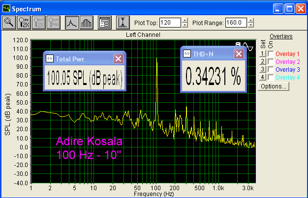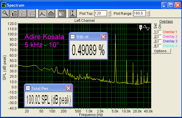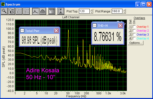 The Sound I tested the Kosalas with a Sony SACD Player, Balanced Audio Technology VK-5i Preamplifier, Balanced Audio Technology VK-75SE Power Amplifier, Nordost Cables, and BetterCables. What I heard in my own environment confirmed what I had heard at CES. These speakers are really very good, and especially so at this price. The lack of veneering on the front and rear helps to keep the price down, and as long as you are comfortable using speakers with the grille on, they will appear no different than front-veneered speakers with the grille on as well. I would characterize the Kosalas as very warm and laid back. I think that is what Dan Wiggins, at Adire, had in mind, as evidenced by his demonstrating them with a tube setup. They also have a huge soundstage, almost twice as wide as the physical placement of the pair from left to right. I asked Dan about this, and he said that the placement of the tweeter directly in line with the center of the woofer, along with the crossover, was the reason. I like classical music more than other types, and like to listen in the evening with a cup of tea and a newspaper. I don't like the sound to intrude on my reading. That is probably why the Kosalas were so appealing to me, with their laid back attitude. As to tonality, all orchestral instruments, including the very difficult piano, sounded completely natural. Voices too, had a natural aura about them. No chestiness, nasality, or tizziness was there to destroy the illusion. On the Bench At 50 Hz and near 100 dB (I decided not to risk turning it up any louder, as the speaker was straining), the distortion was rather high, at almost 9%. Adire says that the Kosala is optimized for sounds above 50 Hz, and they were not kidding.