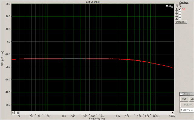 Above is the measured frequency response of the CD portion of the player, using regular 16/44 tracks. This measurement was taken from the RCA outputs. You can see that the player exhibits a very flat response to 5 kHz, where it rolls off to -6 dB at 20 kHz. (A loop-through test with just the computer sound card that we use to measure response is flat to 20 kHz.)