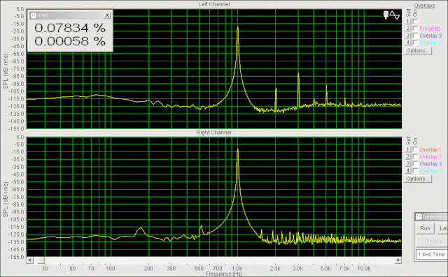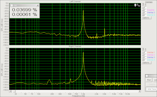 As you can see, this layout makes it easy to navigate 2,000 tracks. Again, the knobs are a gift when you have to enter in a track name by hand. The CD Rip feature and CD naming really help when encoding CDs to the HD. The 1HD also has auxiliary inputs. This allows you to connect satellite navigation, or extra audio devices directly to the unit. The aux input is controllable with the volume knob as well. MP3-Encoded Audio Performance I encoded my test CD at the highest bit rate, then measured the resulting frequency response and THD. The results indicate that they are almost identical to the CD performance.
