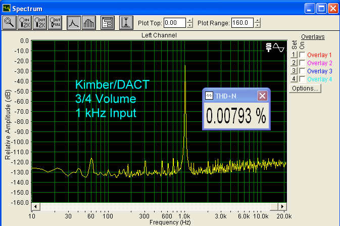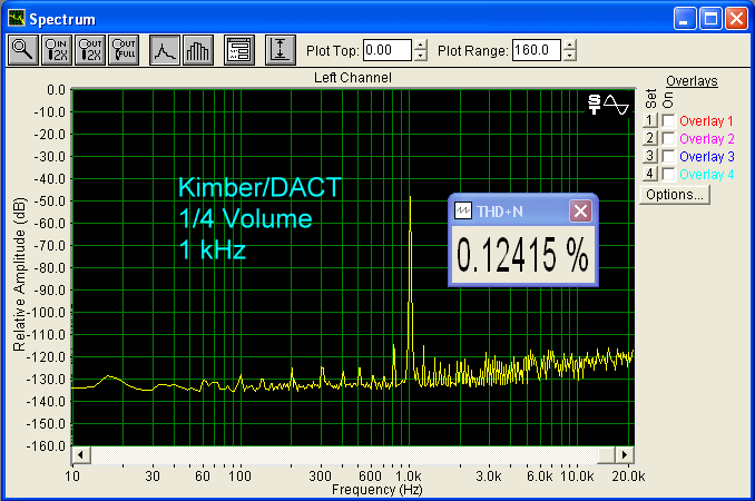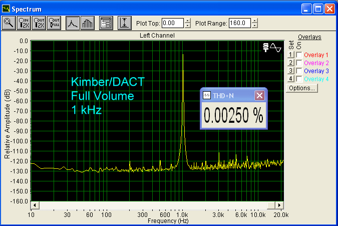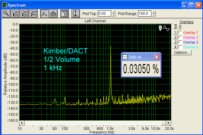 Most DVD-A players and SACD players do not have bass management for DVD-A and SACD disc output yet, and a typical processor does not have analog bass management for any 5.1 analog input, and since bookshelf speakers don't usually respond well below 60 Hz or so, the bass problem (lack of bass management) affects not only the passive volume control reviewed here, but existing players and processors as well. Since there is no bass management when using a passive volume control, for the ideal situation, you would need to have all the speakers be full range and equidistant from your listening position. However, you would also need that fancy processor with all the buttons, menus, and jacks. The purpose of this article is how to keep it simple, but know that there are limitations. So, if you want to try something like this, start out with an inexpensive 10 kOhm pot from Radio Shack, make some interconnects, and see how it sounds. If you are happy with it, then go for the good stuff. Distortion measurements were good. Most of what we are seeing here is noise that is at an extremely low level, approaching the noise floor of the test equipment. At full volume, distortion and noise are 100 dB below the signal. These tests were done with the sound card generating a test signal, output to the Kimber/DACT, and the output of the Kimber/DACT connected to the sound card input.