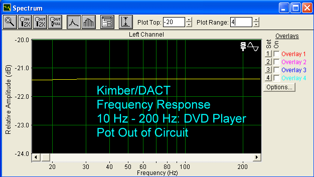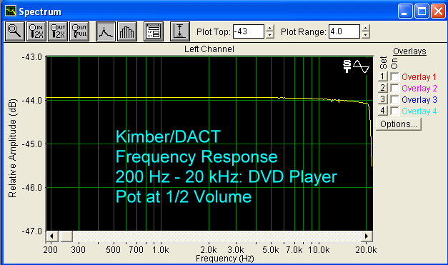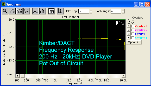 I connected the Kimber/DACT box to a McIntosh MVP-851 DVD Player that has DVD-A capability. I used the 5.1 analog jacks on this player, connected to the Kimber/DACT, and then directly to a five-channel power amplifier (Rotel RMB-1095) that has 200 watts per channel into 8 Ohms. The sixth gang was connected to the line-in on a Velodyne HGS-18 subwoofer. A variety of speakers were used. The Sound First, let's talk a bit about what a preamplifier does. (1) It switches sources. So, if you have a VCR, TV, and DVD player, it lets you connect your audio system to any of these sources. Since I only use my surround sound system for watching DVD movies, this was not an issue. I could leave the Kimber/DACT connected to my DVD player all the time. (2) It amplifies weak signals (100mV) to levels (1V - 10V) necessary to drive power amplifiers. This was important back when we used turntables and the phono cartridge had low output. Today's sources produce 1V or more. (3) It keeps the output impedance constant and low, regardless of the volume setting. This is where I was a bit nervous about the project. The impedance that the power amplifier "saw" would vary up to 10 kOhms depending on the volume setting, and most output impedances of sources are only a few hundred Ohms. Frankly, I was expecting to have a large attenuation of high frequencies, so I was pleasantly surprised when that did not happen. The sound was very smooth in all channels and very clean. There was no hiss, but I could detect a little hum at the highest volume. This was probably just residual noise from the player when amplified to the loudest level. The high output impedance of the attenuator that the input of the amplifier "sees" is relevant if the load that the attenuator "sees" has a significant capacitive component. In other words, if the capacitance of the cables, or the capacitance of the amplifier input is significant enough that the impedance drop seen by the attenuator lowers substantially at higher frequencies, it will drop more voltage as the destination impedance drops, and thus roll-off higher frequencies. If the cables aren't very capacitive per distance, and kept short on top, this should not be an issue. Some amplifiers, notably tube units, often have capacitive inputs, in which case you'd need a buffer stage following the attenuator to avoid this. The overall volume was plentiful, and just a little too loud for my tastes at the highest setting. I ended up using a level at just above midway on the potentiometer. The blend between the various channels was remarkable. They seemed very much like one package rather than five individual speakers. I suspect this was because of the minimal signal path. There is definitely something to keeping it short. The best part was that I did not have to push any buttons or worry that I did not have the correct settings, or correct jacks, on a processor. The McIntosh played all the discs, including movies with DD and DTS soundtracks, DTS CDs, and DVD-As, through the 5.1 analog output jacks, into the pot, and into the power amplifiers. The darn thing just worked, no matter what I put in the player. You can, of course, build the unit with individual single-gang potentiometers, so that you can have more control over each channel. However, this raises the cost and complexity. The present review focuses on simplicity. The cables could very well end up being the most expensive part of the unit, but you need interconnects whether you use a processor or a passive volume control anyway. You can build this project as cheaply or as expensively as you wish. The sound was not as full-bodied as what I get from my processor (Theta Casablanca), seeming a bit thin. I thought perhaps this might be due to a loss in bass, so I put the Kimber/DACT on the bench. The Bench Tests A frequency response test showed that the Kimber/DACT had a flat frequency response that did not change from the response obtained when the DVD player was connected directly to the sound card. So, at this level, the thinner sound of the Kimber/DACT, compared to the processor, is unexplained. There may be more harmonics generated during processing and active preamplification. Or perhaps, there are other factors, such as the presence or absence of capacitors at inputs or outputs. The bottom line is that you will need to experiment with your own setup to see if it works for you.