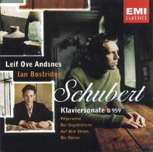 Aware of his impending demise from syphilis (possibly contracted from a male prostitute), Franz Schubert spent 1828, the last of his 31 years, composing some his most profound masterpieces. In September, he completed his glorious String Quintet, D. 956 and final three piano sonatas (D. 958, 959, and 960). Less than two months later, he was dead. Leif Ove Andsnes, winner of the 2002 Gramophone Instrumental Award for his disc of excerpts from Grieg's Lyric Pieces, was 31 when he recorded Schubert's penultimate piano sonata. It is a youthful performance, stronger on drama and energetic momentum than on the sense of melancholy and resignation that pervades portions of the work. Andsnes excels in the thunderous opening chords of the A major, where their contrast with the lighter writing that follows immediately announces the depth of emotion and seemingly unstoppable flow of melody that distinguishes Schubert's penultimate sonata. Most striking is the second movement Andantino, where, midway into the proceedings, Schubert literally breaks the flow of melody with startling, crashing chords followed by extended pauses. The feeling is one of death's sudden, unannounced intrusion. Andsnes marvelously stretches the silences between these thunderous chords, making the effect even more chilling. When played alongside a l999 live performance by 69-year old Alfred Brendel, part of a Schubert four-sonata set (Philips 289 456 573-2) nominated for the 2001 Gramophone Instrumental award, the relative merits of each interpretation become clear. Brendel's greater use of light and shade, of momentary hesitations, and of soft playing conveys a greater sense of all-pervasive sadness. The emotional content is enhanced by a recording whose superior capture of the piano's deep resonance better conveys the monumental nature of Schubert's vision. Brendel is less overtly theatrical – the pauses in his Andantino move along in more or less metric time – but the introverted nature of his performance touches on the deepest levels. Especially striking is the difference with which these two artists treat the final movement. Andsnes' 10.55 turns it into a sunny, lyrical excursion, while Brendel's 13.30 has a valedictory feel to it, as if Schubert is saying that the emotional cycle of despair, death, peace, and rebirth that we experience in the slow movements of many of his final works is coming to an end. When all is said and done, I would not wish to be without both interpretations. The four songs that conclude the disc are related to Schubert's piano sonatas in various ways. The melancholy opening of the the 1821 “Der Unglückliche” recalls the Andante of Schubert's earlier A major Piano Sonata, D. 664. The main theme of D. 959's Andantino recalls the 1823 song “Pilgerweise,” D. 789. “Auf dem Strom,” D. 943 for voice, piano and horn, and “Die Sterne,” D. 939 both date from 1828, and reflect the influence of Beethoven heard in the piano sonata. Bostridge immediately ingratiates with his beautifully fresh, warm tone. The over-inflection that sometimes mars his performances is nowhere to be found. His singing is so lovely that it seems churlish to note that some of the songs could benefit from slower tempos and a greater variation of tone. For example, tenor Michael Schade, partnered by Graham Johnson in disc 37 of the Hyperion Complete Songs of Schubert, offers a more profound interpretation of “Auf dem Strom;” baritone Robert Holl better captures the pained heart of the pilgrim who sings “Pilgerweise;” and Johnson's more pointed playing for soprano Juliette Banse in “Die Sterne” better conveys the joy of the song. Regardless, there is a sheer loveliness to Bostridge's singing that makes it irresistible.