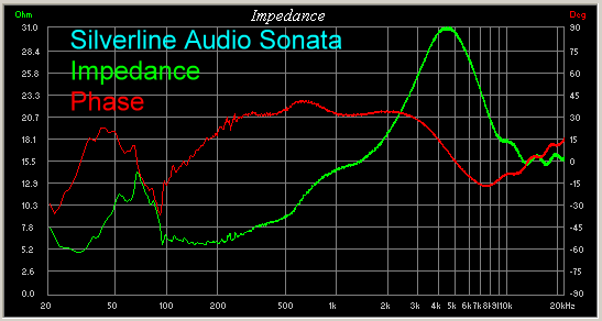 The impedance of the Sonatas has a minimum of 5 Ohms at 35 Hz and a maximum of 31 Ohms at 4.5 kHz. DC resistance is 2.64 Ohms. (Remember that the "impedance" of a speaker is the combination of resistive impedance, i.e., DC resistance, and reactive impedance due to inductance and capacitance.) The electrical phase stays well within ± 450, which is excellent.