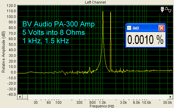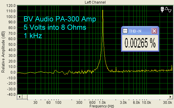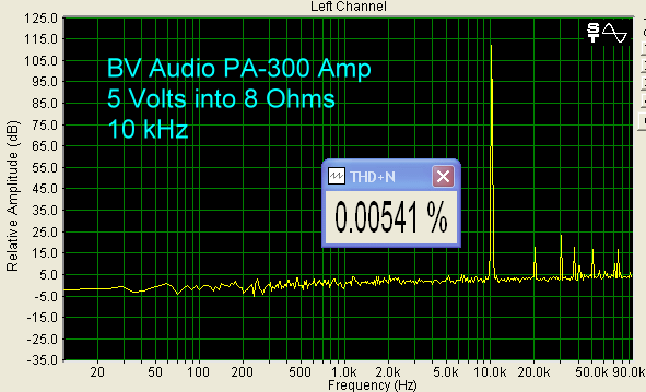 On the Bench At 5 volts into 8 ohms (a few watts, typical listening level), distortion was very low, and primarily second-order (2 kHz), which is excellent.