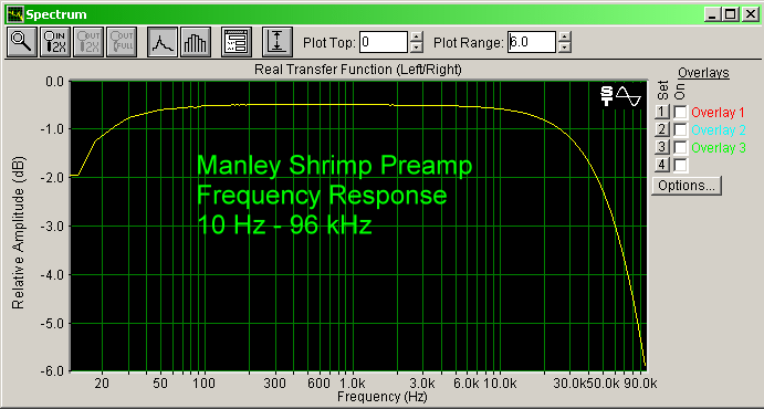 The noise floor of the Manley is excellent. With the volume midway (again slightly higher than a typical listening level with most equipment), the noise level is nearly at the baseline limits of our sound card. The can be verified in a more practical sense by placing your ear in front of the speaker. This is a very quiet preamp. I am accustomed to tubed gear having a slight hum or hiss that is usually audible from a foot or two away. The Shrimp has no such annoyances.