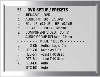 To extend the flexibility even further, component video and digital audio connections can be assigned to any input or even multiple inputs. You may be asking why you would do this with the digital connections, since every input on the AVM-20 has its own digital input. If you go back to my example of using a DVD player for both CDs and DVDs, you now have the ability to have different default surround modes depending on the input you have selected for any given source and/or format. In my system, I have the DVD player's digital input assigned to both the CD and DVD input. However, if you select the DVD input, you will get cinema based surround modes for all formats, but if you choose the CD input, you will get plain old two-channel stereo. For music lovers out there, Anthem has given users the options to set up two speaker configurations, one for movies and one for music. The modes differ by allowing the user to choose different speaker and LFE configurations. This comes in especially handy if you prefer to use the standard 80 Hz crossover settings for movies (as recommended by THX), but when listening to music, have lower frequency crossover settings. This should allow the user to avoid localized subwoofer problems that plague some systems when using an 80 Hz crossover. You can even eliminate the LFE altogether if you wish. To avoid having to make the decision of which mode to use on a per input basis, the 'Auto-LFE' mode will choose the appropriate mode depending on the presents of LFE content.