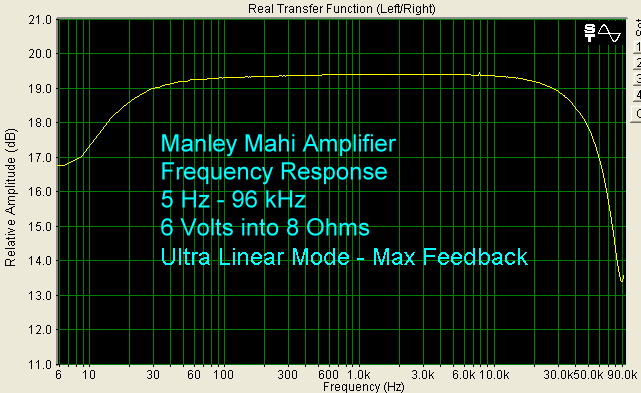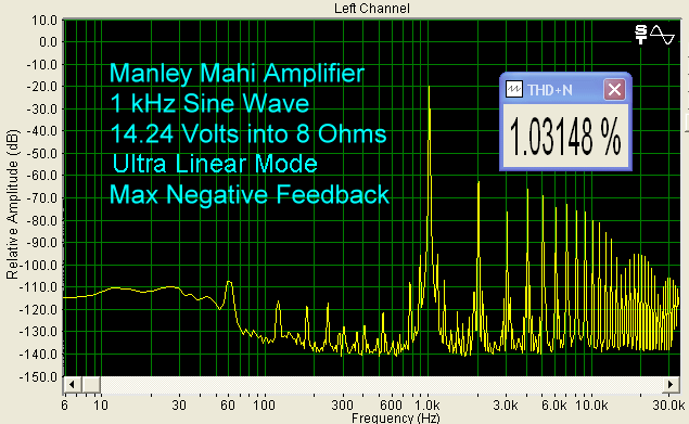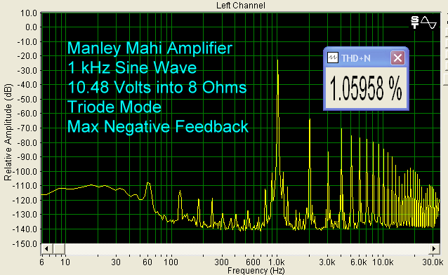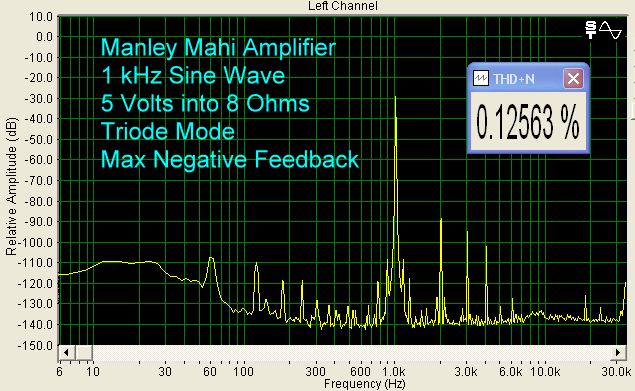 The Sound I tested a pair of Mahis with a Classé CDP-10 CD Player, Balanced Audio Technology VK-5i Preamplifier, and Magneplanar MG1.6/QR Speakers. Cables were Nordost, BetterCables, and Analysis Plus. Like other tube products, the Mahi needs about an hour to sound its best. The hot temperature is an important part of the way tubes work, and while the filament is the only structure that is heated by current (in order to allow electrons to flow), the rest of the tube gets hot too, and it takes a while for everything to stabilize, including the glass envelope. The Mahi has a little more hum than my BAT VK-75SE, but a little hum and hiss are common with tube amplifiers. You can see this in the bench test graphs below. Notwithstanding a little more background noise, the Mahi sounded very much like my VK-75SE, at least at low-medium volume. It was very clear, and quite smooth. I fooled around with the negative feedback switches and triode/UL switches a lot at first, and I could easily hear the differences. With minimum feedback, the sound had a much more full bodied midrange, while maximum feedback seemed to make the sound more even across the frequency range. Going from triode to UL, the leading edges of the sound had more snap to them. My final choice was maximum feedback and UL mode. The Maggies are not easy speakers to drive (4 Ohms impedance, 86 dB/2.83v/m sensitivity), but that is why I use them in product tests. I found that the Mahis sounded very good at modest volume, but tended to be mushy at higher volume. This really is not surprising since the Mahi is a relatively low powered amplifier. So, I just listened at moderate volume and enjoyed the heck out of the Mahis. By the way, with a pair of these, you have Mahi Mahi, which is the proper name for the fish. Whether it was single piano, such as Chopin: The Romantic Pianist, or Violin Concertos, such as Sarah Chang playing Dvorak, the Mahis gave me afternoons and evenings of great pleasure. The instruments were clearly delineated, and I had no problems visualizing a large soundstage. Because of the low power output, better performance will be achieved by using more efficient speakers with the Mahi. I would suggest something on the order of 90 dB/w/m, or higher. Besides the Maggies, we used the Mahis with our Krix Esoterix speakers (8 Ohms, 88 dB/w/m), which were a better match. On the Bench Output at clipping (1% THD + Noise) for a 1 kHz sine wave into 8 Ohms, using Triode Mode and maximum negative feedback, was 10.48 Volts, which represents 14 watts. In UL Mode (Ultra Linear Mode), we got 14.24 Volts at clipping, which is 26 watts. Note that this is 26 watts into an 8 Ohm load. The Mahi is specified into 5 Ohms, so 26 watts into 8 Ohms is equivalent to 40.5 watts into 5 Ohms, which is right on specification. Using lower amounts of negative feedback increased the amount of distortion. For example, leaving everything else the same for the UL clipping test, changing the negative feedback from Maximum to Standard, the THD went from 1% to 14%, and at the Minimum negative feedback setting, it went to 23%. The output voltage at clipping between max feedback and min feedback was about the same, and since I preferred the sound at max feedback, the best performance for me was in UL Mode and maximum negative feedback. Distortion tended to be more of the even-ordered variety, and at 5 Volts into 8 Ohms, which is a typical listening level, there was about 0.1% THD. Tube products typically have more distortion than solid state, often because less negative feedback is employed. That is just part of what you have to accept if you like tubes.