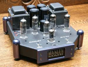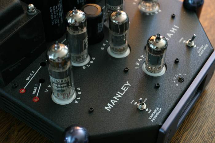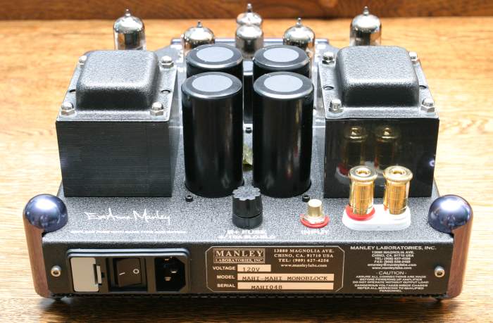 The rear end of the Mahi is pretty simple. There is an On/Off power toggle and grounded AC socket for use with the included detachable power cord. The connectors are also nearby, with an RCA input jack and five-way speaker binding posts. The power toggle is on the rear instead of the front for a good reason, namely, that it keeps the AC in the back corner hear the power transformer and power supply capacitors, and away from the input circuits. Instead of the usual flat round feet, the Mahi has four corner posts that are pointed at the bottom for maximum isolation from the table on which they sit. The front panel, with the Manley logo, is illuminated for the retro-look that tubophiles love. The overall appearance of the Mahi is one of elegance. They are beautiful.