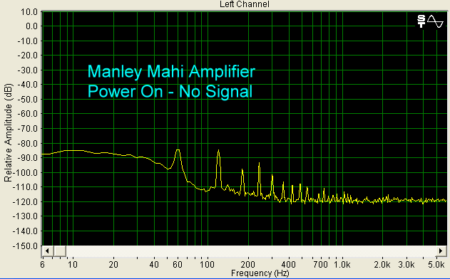 Below is a graph with the amplifier powered on, and input cables and output cables connected, but no input signal. It shows that the Mahi has a significant amount of AC ripple, and this is the hum that I was hearing. I have tested more expensive power amps that have hum too, and less expensive tube products that don't have this much. It is just another thing that is part of dealing with tubes.