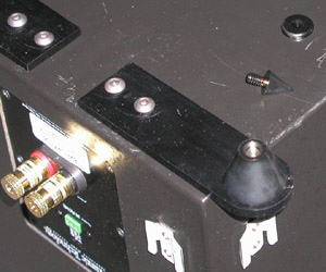 that this flexibility is present. The PedWoofers (Ped->Pedestal) can either be used as a "stand" for the main front channel speakers or off by themselves. There are threaded posts that screw to the top of the PedWoofer and the 8200 LR can slide into these posts. If used as a stand for the 8200 LR, Atlantic recommends having the drivers face the center of the room. The PedWoofers are marked left and right for this purpose, although there is nothing that prevents you from making them face the side walls. In fact for the rear surrounds, the 8200 LRs were so close to each other that I pointed the drivers towards the side walls. Spikes are provided that screw to the bottom of the PedWoofer. The pointed ends can be unscrewed if the speakers are to sit on hardwood floors.