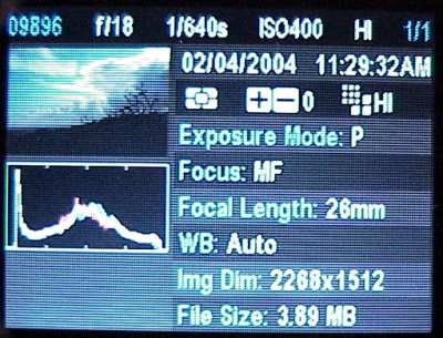 Pressing the Info button shows the following information about each photo that has been taken. It displays a small version of the photo in the top left corner and a histogram underneath.