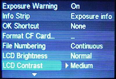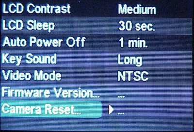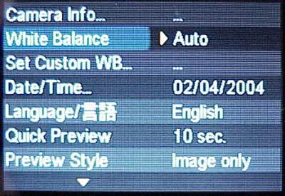 Pressing "Menu" gives the following display on the TFT screen (shown below). White Balance can be set to Auto or such things as Daylight, Incandescent, Fluorescent, etc.