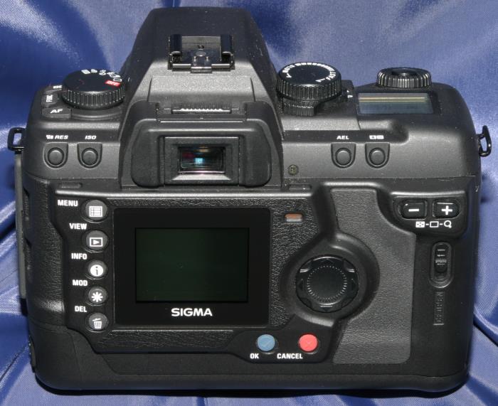 On the right side are dials for selecting Program (the camera sets everything), Aperture Priority (lets you change the aperture to a preferred setting), Shutter Priority (let's you change the shutter speed to a preferred setting), and Manual (you make all of the exposure settings). The round dial to the left of the LCD panel lets you change the shutter speeds. The shutter release is above the LCD panel, and the dial surrounding the shutter release lets you change the aperture. The LCD panel shows all of the exposure settings and other status. Just below the dials is a row of buttons for changing the resolution, the ISO (variable from 100 to 1,600), auto exposure lock, and +/- controller for adjusting exposure. A slider above the eyepiece adjusts the diopter for consumers who wear eyeglasses. The battery compartment is along the bottom. You slide it out and insert two lithium CR-V3 batteries or four AA cells. I would like to have seen a set of rechargeable lithium batteries here, as other digital SLRs routinely have them now. Some will even let you charge them in the camera. The Compact Flash drawer is on the right side. I found it a bit difficult to grasp the card to remove it for use with a card reader to upload my images to the computer. A little more finger room please. You can connect the USB jack on the SD10 to your computer and leave the card in the camera, but this consumes battery power. I always use an external card reader. The rear of the SD10 is shown below. The buttons are nice and big, and are easy to read (the instruction manual is refreshingly clear as well, by the way). Menu shows the various setting options, View lets you scroll through the pictures you have taken, along with the dial on the right, enlarging them with the - and + buttons on the above right, Info shows you the exposure data on the photos you took, Mod lets you rotate the images, and Del lets you get rid of the bad ones before anyone else can see them.