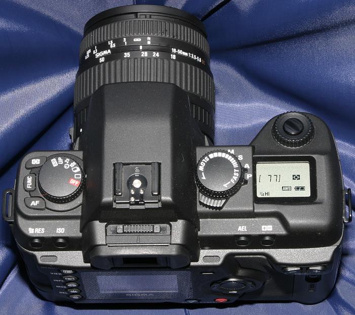 Because the pixel colors are vertically arranged (stacked) instead of side by side, more total pixels can be placed on the same chip area. The Foveon X3 chip has more than 10 megapixels in a chip about the same size as a 5 - 6 megapixel standard Bayer CMOS or CCD chip in current cameras. Right now, the Sigma camera line is the only one that has adopted Foveon X3 chip technology, probably because they did not have Bayer CMOS or CCD chip factories that would have to be retooled. Lucky Sigma, because the X3 is a heck of a chip! The SD10 is the third model that Sigma has marketed. Changes from the SD9 include more sensitivity and some other features in the camera body. Although the MSRP is $2,000, I have seen it for $1,599 including two zoom lenses. That makes them way, way less expensive than competing models, most of which are in the 5 - 6 megapixel resolution range. (The body only can be purchased for $1,349.) Of course, there is more to a camera than just the sensor, so let's take a look specifically at the SD10. Features The front of the camera is shown in the photo at the beginning of this article. The top of the camera is shown below. The appearance is not unusual. The dial on the left is the "Drive Dial", selecting single frame shooting, multiple frame shooting, self timer, mirror lockup, and auto bracketing (takes sequential photos at different exposure settings). Buttons control spot metering and auto focus lock. The Function button turns the beeps on or off.