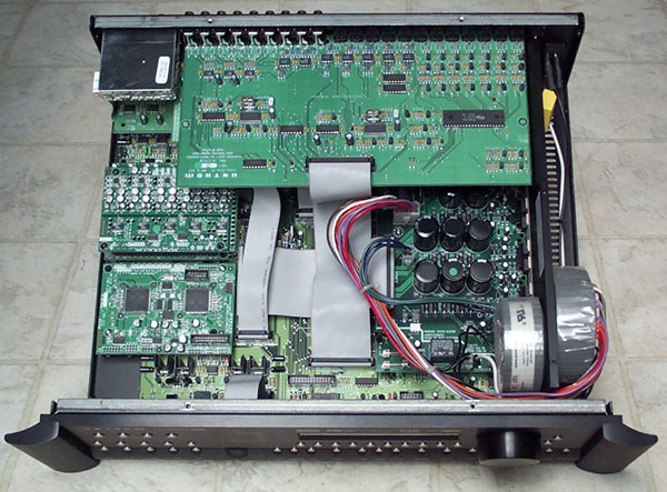 Anthem doesn't not quite have all the THX standard colors on their multichannel I/O jacks (there is no distinction between main, surr, and rear). I suppose I should be more upset with THX for being "loose" on this requirement as I know they are, but either way, I have to point it out. It is such a simple thing which time and time again I've been thankful for when making connections hunched over the back of a rack where labels are all but useless. There are three 12V trigger outputs (1/8" jacks), two infrared outputs (also 1/8" jacks), and a 12V terminal strip to power such things as IR receivers. A DB-9 RS-232 serial port serves not only as a vein for the D1 to communicate with whole home systems, but also opens up the D1's brains for software upgrades and changes. Although after all that, it seems banal, antenna terminals are there for the built-in AM/FM tuner. The only spot on the back not populated has been conspicuously labeled "IEEE-1394" (though as of this writing, that spot is not going to be blank for much longer). There are four independent zones (or paths if you prefer to think of it that way). The Main Zone is the full 7.1 channel layout. Zones 2 and 3 are completely independent 2 channel paths complete with volume and tone control. The 4th is the Record path, again, independent of all the others. Any source can be routed anywhere. That's where the resemblance to the AVM-20 ends. Under the hood things start to take on the different shape. In the D1 both the main power supply and stand-by power supply are torodial (the stand-by in the AVM-20 is a standard iron core). The D1 employs more than twice the computing power of the AVM-20, with a pair of Motorola 56367 DSP units running the show. While simply looking at the model of DSP and their MIPS provides no line on which to judge an SSP, it is a concern from the point of view that we don't know what's around the corner. It has been demonstrated how a new decoding scheme can put greater demands on an SSP's computer, or require a new one all together. No matter how many 56366 DSPs were in the AVM-20, it would take a 56367 to do Pro Logic II, but Anthem had the foresight to put the DSP section on a daughter card, making the swap necessary to go to version 2.0 a literal snap. The same physical layout exists in the D1, but I don't think we'll be replacing anything any time soon. Consider that with the twin Motorolas, the D1 can decompress a muti-channel bitstream, do full bass management on seven channels of 24/96 audio, and perform THX Ultra2 or Dolby Pro Logic IIx post processing. 'Nuff said. The D1 uses AK4395 DACs (Digital to Analog converters) and AK5494A ADCs (analogue to digital converters), both capable of up to 24bit/192kHz (though the ADCs are actually operated up to 24/96 only, something we'll explain later). The oh-so critical issue of output stages is answered by Anthem with the choice of BurrBrown OPA-2132 units all around. These were chosen over the OPA-2134 units used in the AVM-20 in part for their stability down close to DC.