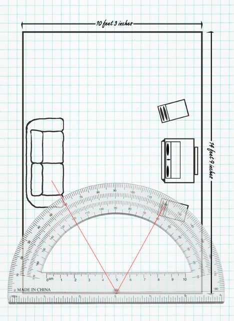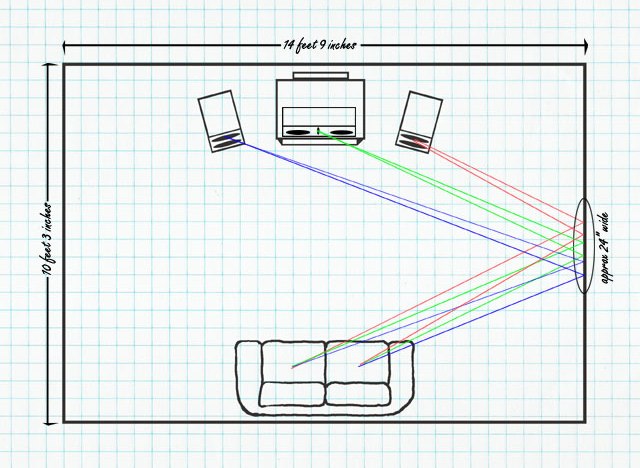 So, let’s get going! To use an extreme example, imagine having your home theater in a cathedral, which usually does not have room absorption on the walls. You press Play, and the sound begins. The first note comes out of the speakers and makes its way to your ears. But, it also begins bouncing off the walls, columns, and ceiling, and then to your ears. Since the reflection path is longer than the direct path to your ears, the reflected sound arrives later than the direct. It would be fine if there were only one musical note. But, of course, new sounds keep coming out of the speakers. The new sounds arrive at your ears along with reflected sound that came out of the speakers earlier in time. This produces "smearing", which is a hodgepodge of different sounds. Bottom line is that you cannot distinguish the details in all that mess. Hallelujah Keep in mind that the goal is to reduce the reflections, not eliminate them, because having an acoustically "dead" room is uncomfortable. You can reduce reflections by using professional materials such as those shown below, but you can also use curtains, wall hangings, rugs, couches, and other things that would be part of the room's decor. The First or Early Reflection Although sound coming from a speaker bounces from wall to wall, ceiling to floor, back and forth several times, it is the first or early reflection that has the most energy (since it decreases with each subsequent reflection), and is the one we are most concerned with. If we can reduce the energy of the first reflection, we reduce all subsequent reflections. The reflections work similar to light being reflected by a mirror, with angles of incidence (arrival) and angles of reflection (departure). You can keep some of the reflection, for the sake of having the room still be "alive", but reduce the smearing, by using "Diffusors" which make the reflected sound leave at multiple angles. Diffusors will be discussed below. Here are some methods for determining the first reflection: The Hand Mirror Method With a hand mirror and the help of an assistant, sit in a listening position and ask your assistant to hold up the hand mirror along the wall, at ear level. While your assistant moves the hand mirror along the wall, look for the reflection of the speaker’s tweeter. When you see it, mark the hand mirror’s location on the wall with some masking tape. This marking is the relevant early reflection point for the chosen listening position. Do this for the left, right, and center channel speakers. Mark the tape "LS- R1" for Left Speaker-Reflection 1, and so on for each speaker. A Scale Drawing and a Protractor. With this method, a scale drawing is made of your room, including seating positions and speaker positions. A protractor is then used to determine the relevant reflection points. This method has the advantage of giving you a clear visual indication of all your seating, your speakers, and the paths of all the relevant sound waves from each speaker. This makes it perfect for determining placement of alternative objects when affixing absorption material is not an option. You will find that, under most circumstances, the markings will be within a 24" of each other for all three speakers. After measuring the dimensions of your room, draw the room on graph paper using the squares to create a scaled drawing. I chose one square to represent six inches for the example in this article. Plot out your seating arrangement and locations of the speakers, measuring the speaker’s position relative to the wall from the front of the speaker. Sliding the protractor back and forth along the wall in the drawing, look for a point on the wall where a line drawn from the center of the protractor directly to the face of the speaker shares the same proportional angle as a line drawn directly towards the listening position. The angles are measured from the 90 degree mark, which is the middle point of the length of the protractor. Here is a look at all the relevant reflections for one side of my home theater room. Converting from the graph paper squares back into feet, a two foot section of acoustic material would be centered on the wall about five feet forward from the back wall. Notice how all the reflection points covered an area of the wall that is approximately two feet wide. Depending on their size, this makes one or two panels of acoustic material perfect for covering this area (many of the panels are 24" wide). Repeat for the other side.