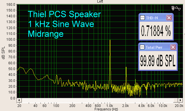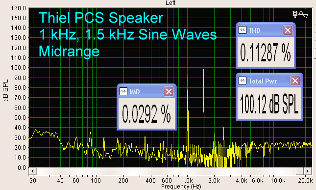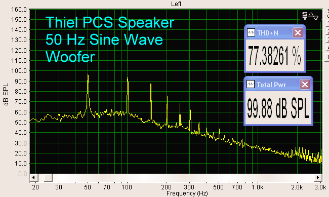 Voices, such as Tony Bennett, sounded very natural on the PCS. There was no boominess, no chestiness, and no sibilance. The increased frequency response of the PCS above 18 kHz (see On the Bench, below) does not affect the human voice (too much sibilance is a result of peaks around 6 kHz). Although the PCS are powerful speakers, they are a bit weak in the bass for my tastes (I really love deep bass). So, for those of you with similar slants, I would recommend the use of a good subwoofer. We had on hand the new Thiel SS2 subwoofer and Subwoofer Integrator, which were fantastic additions to the PCS. I will report on those products in later reviews. Recordings where the addition of the subwoofer really made a difference included Stravinsky's The Firebird (Telarc SACD-60039) and Tchaikovsky's 1812 Overture (Telarc SACD-60541). On the Bench For THD measurements, the microphone was placed 6.5" from the corresponding driver. Frequency response measurements were made at 1 meter distance from the center of the speaker, on axis. The PCS are rated down to 55 Hz. Using a 50 Hz sine wave input signal, THD+N was very high, showing that the PCS are not meant for sounds below that 55 Hz rating. It indicates to me that a subwoofer should be used, with the low-pass set to perhaps 60 Hz for best results (high-pass at 60 Hz and above to the PCS, low-pass below 60 Hz to the subwoofer).