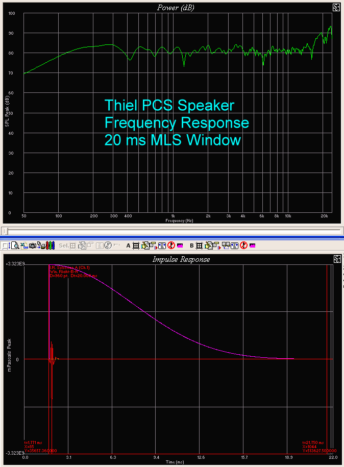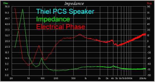 plated speaker binding posts that will accept large spades and banana plugs. The enclosures can be purchased in several wood veneers. The review units were in Amberwood, which is one of my favorite finishes (it looks like Rosewood). My favorite veneer is Cherry, which is also available from Thiel. (My favorite exotic woods are Jarrah and Bubinga, which are rare and not generally available.) A rap on the enclosures is reassuringly solid, with very little resonance. The front baffle is 2" thick, while the main enclosure is 1" thick. Heavy internal bracing is also employed. The front baffle is at an angle, with the tweeter somewhat back from the woofer. This is what Thiel calls "Coherent Source", and PCS stands for Personal Coherent Source. It basically means that the drivers are time aligned so that the signal from the tweeter and woofer arrive at your ears coincidentally (at the same time). The edges of the front baffle are rounded so as to minimize edge diffraction. The Listening I tested the PCS with a Classé SACD-2 player, Balanced Audio Technology VK-5i preamplifier, McIntosh MC-602 power amplifier, and Nordost cables. The PCS sound quite forward in the high frequencies, and this is confirmed in the frequency response tests. Detail was excellent as a result, without being harsh, which my aging ears really appreciate. Usually, if a speaker is high frequency forward, it can sound "bright" which is often unpleasant. Not so with the PCS. My McIntosh MC-602 can dish out 600 watts rms per channel without flinching, and the PCS took all that was delivered without sounding mushy at high volume. They are not very sensitive though, so you will need plenty of power to show off their capabilities. I toed the PCS in at about 100, which gave me a terrific soundstage and no hole in the middle. Off-axis sound was excellent too. The PCS sound much bigger than they are physically (the soundstage is huge). This is a result in part from the time alignment and the coaxial tweeter and midrange driver configuration. Diffraction effects are minimized. Using SACDs with speakers that have such fine detail is an ideal showcase for both products, but conventional CDs also shone on the PCS.