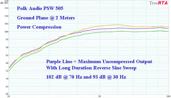 Peak Dynamic Output: This test measures how loud the subwoofer can play across its pass band with a short-duration signal representative of typical music and movie transients. Frequency response sweeps were conducted at progressively louder (2 dB increments) levels until dynamic compression was noted. The green curve (midle curve in the graph shown below) represents the maximum uncompressed dynamic output of the PSW505, with 105 dB at 70 Hz, and 95 dB at 30 Hz. The next higher curve (purple) showed dynamic compression, and the test was subsequently terminated.