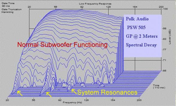 Impulse Response and Spectral Decay: The impulse response (black line) shows transient overshoot and system ringing for about 40 ms. Spectral decay was evaluated to the –35 dB mark, relative to the test volume. Several minor system resonances were noted in the 20-100 Hz bandwidth. The largest resonance dropped below the test floor after about 110 ms.