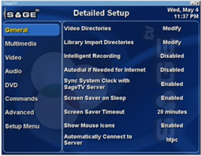 It features a very intuitive layout with easy navigational controls. If you have a wireless keyboard and mouse, you can use the many keyboard shortcuts pre-programmed or create your own. You can also use PC and non-PC based remote controls, as explained later in this review. In order to get the system to a basic, usable configuration, you enter the Setup menu, and choose the Setup Wizard. This guides you through configuration of the TV tuner card and your TV service provider. SageTV allows you to use antenna, satellite, and cable, even if you have set-top boxes. Once configured, the system asks you for your ZIP code, which allows it to find your available TV service providers. You select your provider, and then SageTV downloads your appropriate Electronic Program Guide (EPG) data, which will allow you to view, record, and schedule television viewing based on the familiar grid layout. This service is provided as part of the system; no additional fees are required. The EPG data supplied through SageTV are only available for the US. However you can still get data for other countries with a third party plug-in such as XMLTV. You can even write your own! Since it is primarily a TV application, the wizard ends there. All other configuration is done through the Detailed Configuration menu in the Setup screen. This includes things like where you want to store or record your media (which hard drive), audio/video settings, and other advanced configurations.