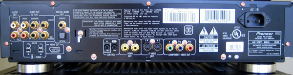 makes for an excellent digital transport. While not having the monstrous heft of the mid to upper level Denon players, the Pioneer still feels very solidly built. It weighs in at 12 pounds 2 ounces, in an average size frame. The faceplate is clean, and of course, a perfect match with the other black Pioneer Elite products. The front panel has a minimal number of buttons and controls. The power switch is Standby/Off with no hard switch. The button size and placement are excellent, with an oversized Play button which is easy to find in the dark. Stop, Open/Close, and Track Fwd/Rev round out the navigation controls. In addition, there is a Progressive/Interlaced selector and a Pure Audio control which disables all output except analog audio. Both buttons have a corresponding LED indicator to let you know when they are active. There is an additional indicator which lets you know the i.LINK connection is active. iLink lets you send digital DVD-A signals to receivers that have iLink inputs and appropriate decoding capabilities. The display is amber like the Pioneer receivers. Non-character indicators are quite small and minimal. They include: 5.1 Source, Progressive, DD, DTS, SRS, and GUI (menu on-screen). The character display handles the rest of the duties . . . well almost everything else. There is no indication for SACD or DVD-A playback (other than the generic 5.1 indicator), which is an unfortunate omission. When you use the i.LINK connection with a Pioneer receiver, this isn't an issue, since the information is passed to the receiver display, and displayed on the character screen there. The rear panel has two composite video, two S-Video, one set of component video, one iLink, and one HDMI output for the video, along with a stereo analog pair and a set of 5.1 analog audio outputs. There is also one coaxial digital audio output and one iLink output. The AC cord is two prong (non-grounded), detachable. The iLink can carry full SACD and DVD-A signals, while HDMI can carry only stereo digital audio.
