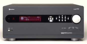 The 990 has a handsome front panel that is relatively austere, given its large area. A narrow stretch down the middle holds the display and all of the main controls. The controls consist of four cursor control buttons flanking a center enter button and eight other smaller buttons for controlling the tuner and radio presets (3), on screen menu, mute, input, surround mode, and tone control. The input and surround mode selections are accomplished by first pushing their respective button and then using the cursor up and down buttons to get what you want. I prefer to have direct selection for both of these, even on the front panel, but this is a minor inconvenience. The front panel is rounded out by a solid-feeling volume knob, a full featured set of front inputs (composite video, S-Video, stereo and optical digital) and input for the set-up microphone. These front panel inputs are nicely hidden under removable covers.