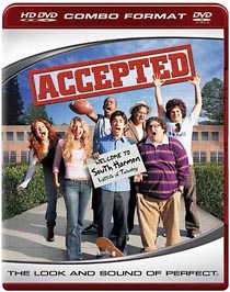 "Accepted" (HD DVD) Synopsis When every college turns him down, Bartleby "B" Gaines decides to create one. Welcome to the South Harmon Institute of Technology, where the students teach the classes, the dean lives in a trailer in the back, and Bartleby's on the way to scoring with the girl of his dreams. Commentary Bit of a cookie cutter here. Accepted is a fun young adult comedy that takes a bunch of underachievers and shows how they can shine. Overall this has some funny moments and it borrows a lot from films before it. While I wouldn't recommend buying it, it makes for an amusing rental. Technical Like most modern comedies, this one has a nice color palette and some decent detail. The image wavers a bit in terms of detail and at times appears unnecessarily soft. Color rendition is excellent though, and the image stays consistently clean. Not really much to complain about here other than the occasional moments of softness. The 5.1 mix is pretty average. The film's soundtrack (which has some nice classic rock tunes in it!) makes the most use of the soundstage and does a nice job of filling at least the main soundstage. Surrounds are used on occasion, mainly for atmosphere. The center point of the film is the dialogue, and it always sounds clean and natural. Extras Universal has given this title the hybrid treatment with the SD version on the flip side. It also features U-Control for interactive features such as a picture-in-picture commentary and production photos. You also get a boatload of features on the SD side. - Kris Deering -