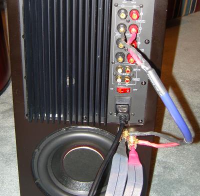 At the top is the subwoofer power amplifier, with, from top to bottom, rotary controls for Crossover Frequency (30 Hz - 150 Hz), Phase (continuously adjustable from 00 - 1800), and Volume. Underneath the controls are speaker-level and line-level inputs and outputs. At the bottom are the On/Off power amplifier toggle, the grounded AC socket, and the main speaker binding posts. The subwoofer driver is there, with the slotted port. You can connect the speaker outputs to the main binding posts and a subwoofer line-level output to one of the line-level inputs on the Strata Mini if you like. However, each Strata Mini has a powered subwoofer, and most receivers and SSPs only have one subwoofer output. AV123