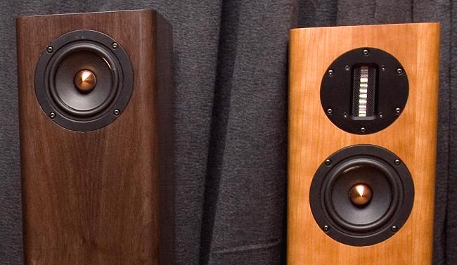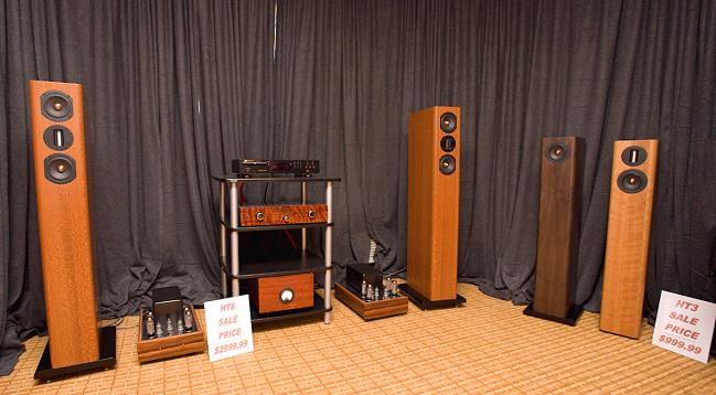 RAW Acoustics, a Canadian company, makes speakers that not only sound great, but are beautiful to look at as well. Shown here are the HT8s and HT3s (top photo), and a close-up of the HT3s (photo below). You can see the ribbon tweeter, which is very popular in speaker designs these days.
