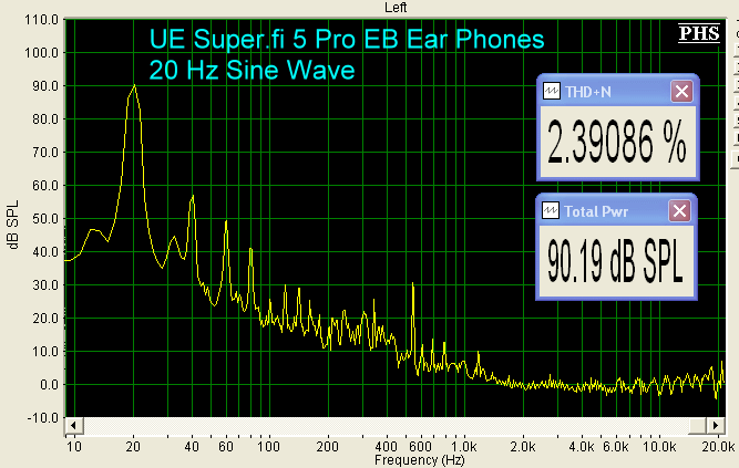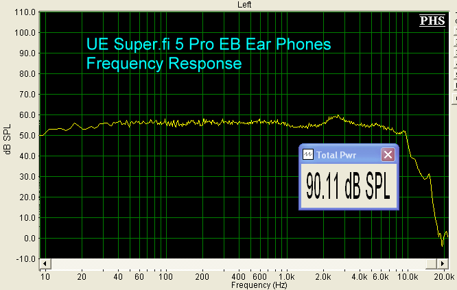little more than half an ounce. These phones are curved, and have a large enclosure. They fit reasonably well, but are harder to keep in the ears than other phones. Like their 5 Pro brothers, the 5 Pro EBs have two drivers, one for the high frequencies and one for the lows. Most in-ear phones use what are called Balanced Armature drivers, instead of dynamic drivers. This allows for a better frequency response in spite of their small size. The 5 Pros use two balanced armature drivers, while the 5 Pro EBs use a dynamic driver for the low frequencies, and a balanced armature driver for the highs. The balanced armature drivers are more expensive than dynamic, thus the higher cost for the 5 Pros. But, as you will see below, the performance difference was unexpected. Look at that frequency response! Pretty flat (comparatively) all the way out to 10 kHz. Good bass response too, and that is what they are designed for. Overall, the response is better than the more expensive 5 Pros, and that seems a bit odd.