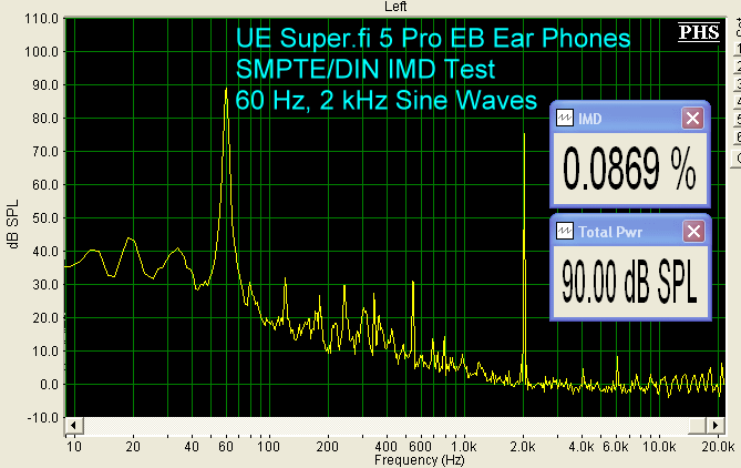 For IMD, notice that the peaks on either side of the 2 kHz fundamental and the second harmonic at 4 kHz are very small. This is really good performance. Again, it's surprising, in that the 5 Pros perform somewhat lower, but are more expensive.