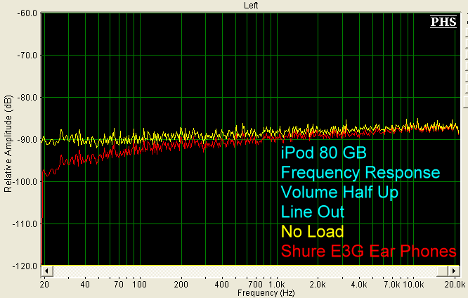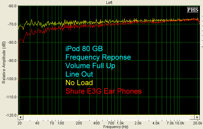 New Ear Phones I decided that it must be the ear buds. They probably were about $2 of the $349 that I had paid for the iPod. I decided to try using better quality ear phones. So, I contacted Shawn McGloughlin of Full Compass. I asked if I could get a few nice ear phones for an article I wanted to write about MP3 players and whether or not using better ear phones than the ones that come with the players makes any difference. He responded by sending me a huge box of them (and I mean a BIG box that Susan wants me to move out of the dining room). Denon also sent me some ear phones. I will probably get more in response to this article, as I am focusing on the iPod itself here, with the report on the various ear phones to come shortly. Anyway, I excitedly unpacked some of the ear phones. I plugged them into the iPod, and listened to some of my favorite Baroque classical music. The highs were clearer, but the midrange and bass were still lacking. What the heck? Even the phones that were labeled as being for those consumers who really love bass (yours truly), and have big "enclosures" . . . well, the bass was just not there. Scratch theory number 1. Theory Number 2 Realizing that the poor bass was not the fault of the ear phones, I decided to take a deeper look into the iPod itself. I did a Google search and found that there were a few bench tests out there, indicating that the bass rolled off when the iPod had a load (ear phones, impedance of a few dozen ohms). Here are some links: http://home.comcast.net/~machrone/playertest/playertest.htm http://www.machrone.net/mt/archives/2010/09/ipod_nano.html. But, I wanted more data, such as specific distortion numbers. So, I decided to put the iPod through one of our bench tests, measuring distortion and frequency response. On the Bench First, I created a number of test tones, including sine waves, pink noise, white noise, and frequency response sweeps. I moved them into iTunes and stored them as Apple Lossless files, and also in MP3 format (192 kb/sec). This is the highest MP3 quality iTunes has available. Then I "synced" the iPod with the test files in two directories. I connected several adapters to the iPod so that I could simultaneously play the files into just the sound card on my computer (10 kOhms, essentially no load) and also have ear phones connected in parallel (I selected the Shure E3G in-ear phones for this - impedance 26 ohms - as they were the ones I liked best at this point, having listened to four sets of ear phones). All tests were performed with the EQ set to Off. Here are the results. The frequency response at full volume and half volume is shown below. Even with no ear phones, the response falls off significantly starting at 10 kHz to be ± 3 dB from 20 Hz - 20 kHz with no load, and ± 7 dB with the ear phones plugged in (± 5 dB at half volume). Hey guys, this is not good. In fact, lousy. (The response graph lines are jagged because I used white noise and was unable to employ transfer functions due to the test signal being generated by the iPod rather than the sound card.)