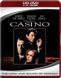 "Casino" (HD DVD) Synopsis This Martin Scorsese film depicts the Janus-like quality of Las Vegas - it has a glittering, glamorous face, as well as a brutal, cruel one. Ace Rothstein (De Niro) and Nicky Santoro (Pesci), mobsters who move to Las Vegas to make their mark, live and work in this paradoxical world. Seen through their eyes, each as a foil to the other, the details of mob involvement in the casinos of the 1970's and '80's are revealed. Ace is the smooth operator of the Tangiers casino, while Nicky is his boyhood friend and tough strongman, robbing and shaking down the locals. However, they each have a tragic flaw - Ace falls in love with a hustler, Ginger (Stone), and Nicky falls into an ever-deepening spiral of drugs and violence. Commentary This is one of my favorites from Scorsese. I was elated to see Universal release this one on HD DVD. The film is hard hitting, disturbing, and REALLY entertaining. An epic of sorts, it covers the lives of three principle characters and their rise and fall in the mobster-run Vegas strip. For any fan of the gangster films, this is a must-own. Technical The HD presentation is far better than I was expecting. I've seen this film several times on various media formats and in theaters, and I always liked the style of it. The HD DVD delivers it perfectly. Colors are vivid and stylized, with a bit of noise. Contrast is exceptional and overdone. Detail was better than I was expecting as well. Despite its longer run time, Universal has done an outstanding job here. The audio soundtrack is great, but not on par with the video. The soundtrack is a bit dated, so fidelity seems a tad off. The monologues waver a lot throughout the film, even in mid-scene, which can be a bit distracting. Tonal balance shifts a lot too. While not a bad presentation, I just wasn't pleased with the consistency. Extras Extras include a look at the story and how the director brought it to the screen from the book. There are also some production featurettes, interviews, and deleted scenes. - Kris Deering -