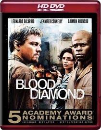 "Blood Diamond" (Blu-ray/HD DVD) Synopsis Amid the explosive civil war overtaking 1999 Sierra Leone, two men join for two desperate missions: recovering a rare pink diamond of immense value and rescuing the fisherman's son, conscripted as a child soldier into the brutal rebel forces ripping a swath of torture and bloodshed across the alternately beautiful and ravaged countryside. Commentary This is a great film that I regret not seeing in theaters. An outside look at one of the many struggles in Africa, the film centers on the fighting and dying going on for the rough diamonds found throughout the land. DiCaprio gives an outstanding performance as a smuggler who uses a mine worker to find a large diamond while masquerading to help him find his son. The production value and story make this a great film and a nice addition to any movie lover's library. Technical I was a little worried what the image may look like on this one as it is a bit long and with the lossless soundtrack and boatful of extras, so I thought that the picture might suffer. Thankfully that is not the case. This is a stylized film, and there are moments when the image doesn't retain that razor sharp feel that most of the close-ups and tighter shots have, but the detail and depth are excellent. Blacks are a bit elevated, which hurts contrast, but color rendition is excellent, as is fine object detail most of the film. I did notice slight banding in some of the "white outs" but they weren't much of a distraction It is nice to see Warner finally supporting lossless soundtracks on their Blu-ray releases. It is a shame they didn't start doing this sooner. Both of these releases have very dynamic soundtracks that impact the most of the surround soundstage and the low end. Despite the active soundfield, dialogue and nuances are preserved nicely, giving it a nice balanced feel overall. Extras Extras are the same on both releases as far as production features, they are just presented differently. The HD DVD uses the IME feature we've become so used to, allowing you to see the content during the feature film. It is also encoded in VC-1 and a bit cleaner than what we see in the Blu-ray supplements. The HD DVD also goes further in adding online support, a new feature for the format, where you can download more content, including maps, and participate in online polls. Unfortunately, I am unable to plug my player into the web, so I was unable to take full advantage of this feature right now. - Kris Deering -