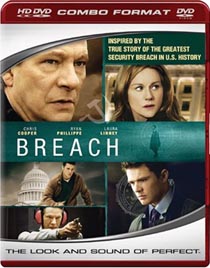 "Breach" (HD DVD Hybrid) Synopsis Inspired by true events, Breach is a gripping and intense thriller that takes you deep inside the halls of the FBI for a top-secret investigation to uncover the greatest leak of classified information in the history of US Intelligence. Commentary I've been to countless training sessions on espionage and sat through LOTS of training on Agent Hanssen during my time in the military. This film depicts the events leading up to his arrest and sheds light on the young agent in training that helped nab him. Performances are excellent across the board, especially from Cooper, and the pacing is excellent. Those looking for a great true-life thriller should check this one out. Technical Since Breach is such a new film, I was expecting more from this one. My biggest gripe is the edge enhancement that is so readily apparent throughout the movie. This is something I would expect from a DVD, but not from HD DVD. Studios, please don't let this turn into a trend. Detail is decent through most of the film though, and contrast excels. The soundtrack is good for a thriller but not as exciting as some of the more action packed titles in the genre. Surrounds do a nice job of conveying space, and the front soundstage is nice and open. Dialogue sounds natural, but some of the ADR (Automatic Dialogue Replacement) is off and distracting. Extras Universal uses the HDi capabilities of the HD DVD format for this one and gives you its U-Control features for behind the scenes footage and commentary while watching the film. There are also deleted scenes, production features, an inside looks at the FBI, and the true story of Robert Hanssen. - Kris Deering -
