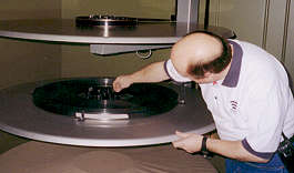 The film comes off the platter in a similar fashion to the way an 8-track would play: from the center out. If you look at the closeup photo of the platter above, you can see the stationary feed mechanism at the center. A sensor on the feeder picks up how the film is being pulled by the projector and controls the rotation of the great platter around the mechanism as necessary to keep the film feeding properly. The film passes through the various sound hardware and advance mechanisms and is taken up by one of the other platters, above or below, ready for the next show.
