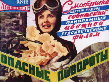 Figure 4. "Opasniye Povoroty" cinema lobby card used at Leningrad Kinopanorama cinema. Photo is of Terri Luik holding Gladiola. The Cyrillic script reads, "Experience the first Soviet dramatic panorama film." |