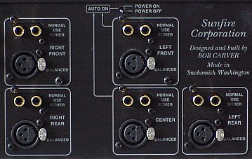 The rear panel of the Signature has all the connectors, including two RCA jacks and an XLR Balanced jack for each channel's inputs, five-way binding posts for each output (one set of voltage source and one set of current source for front left, center, and right), a small toggle on/off/auto switch, and the grounded AC receptacle. All input and output jacks are gold plated. Close ups of the two main sections on the rear panel are shown below. You can see that the auto-on feature is linked to the center and left front channels. This allows for when there is a mono signal that gets fed to the center when Pro Logic is employed, and when there is stereo, with sound in the front left and right channels.