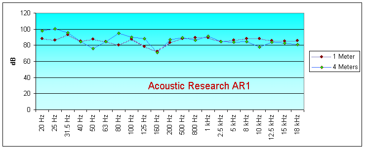 I drove the AR1s with our Balanced Audio Technology VK-500 (250 watts per channel) and the Balanced Audio Technology VK5i preamplifier (both fully balanced). What I noticed immediately was that I only had to turn the volume control up to about 25 instead of the usual 50 on the preamplifier to get a nice loudness level. That's the 95 dB sensitivity raising its head. This is not so important for an amplifier like the BAT VK-500 which has more than 1000 joules of energy storage capacity, but for receivers, it makes an enormous difference. Think of it this way. Let's say you have a receiver with 80 watts per channel and you are using speakers with 89 dB sensitivity. Let's say further that you listen with about 12 watts per channel on average, peaking to 80 watts per channel. Those peaks will severely tax the receiver's amplifiers. With the AR1s, you would only need 3 watts per channel on average, peaking to 20 watts per channel, to achieve the same loudness as with the 89 dB sensitivity speakers.