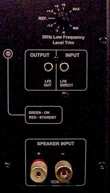 The rear panel of the enclosure has one set of speaker binding posts (all metal), an RCA input jack for separate control of the powered subwoofer, and an RCA output jack if you want to connect another powered subwoofer in series. There is also a small rotary control for adjusting the level of the subwoofer at 30 Hz. An LED indicates power on and standby for the subwoofer amplifier. The AC cable is two-pronged (ungrounded) and is detachable.