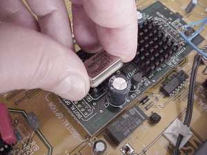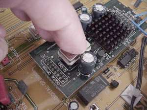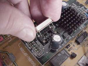 In order to install the 24/132 upsampling chip, I removed the original upsampling chip with my thumb and fingers, and then I followed the procedure shown in the three photos below. (1) I aligned the new chip's pins with two of the sockets (below, left). Make sure the label of the Cardinal chip is facing the same way that the original Fox chip was facing, i.e., not upside down. (2) I rocked the chip forward until the other two pins went into their sockets (below, middle), and then, (3) I pushed the chip down so that it was secure in position (below, right). Obviously, you should do this procedure gently.