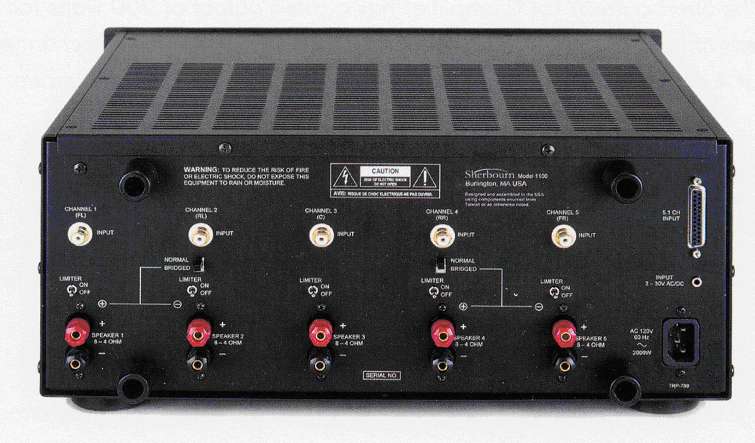 The Sherbourn 5/1500 amplifier is an extremely well built unit. From the solid interior design, to the gold-plated input jacks, to the sturdy five-way gold-plated speaker binding posts, it is first class all the way. They have certainly not cut any corners to cut costs. Each channel is equipped with its own Dynamic Clipping Control Circuit Switch. This is a great feature that protects you from excessive harmonic distortion at high volume levels. You also have the ability to bridge channels One/Two and Four/Five through a rear panel bridging switch. This provides 400 watts per channel at 8 ohms from two channels, and 200 watts from the third channel. A DB-25 input jack lets you connect the 5/1500 to preamp/processors that have the DB-25 output jack.
