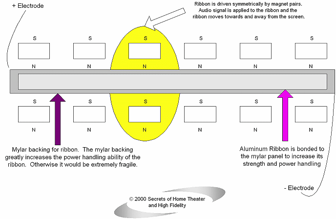 The ribbon material is flanked by opposing magnets on either side. The + and - electrodes are connected to the speaker binding posts, and provide the path for the audio signal. In this picture, when the electrical signal is applied, the ribbon will flex along the horizontal axis, the length of the ribbon vibrates towards and away from the computer screen, while the vertical axis is fixed. Remember, we are talking about a center channel speaker, lying on its side. For the other speakers, the ribbon would be positioned vertically.