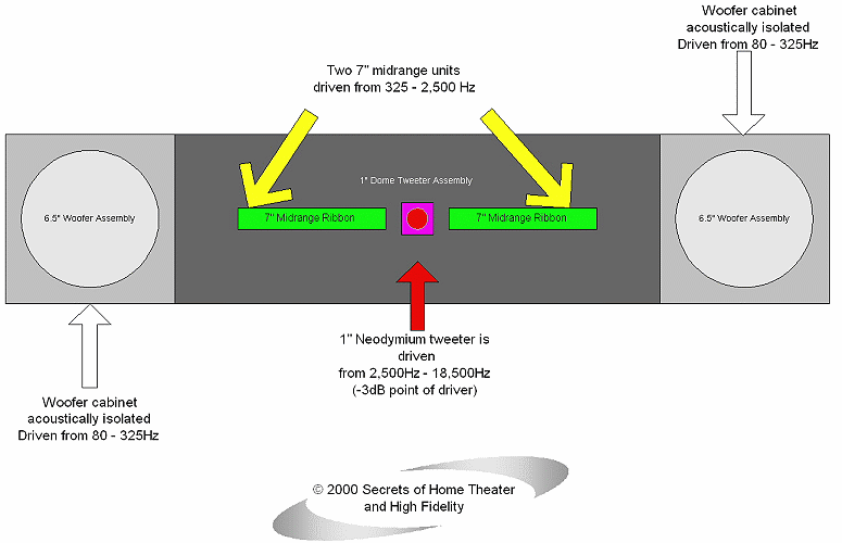 Each woofer driver is in a discrete enclosure, acoustically isolated from the midrange-tweeter assembly. The midrange ribbon looks like two pieces in the diagram, but BG reports that it is a single 22" ribbon divided by the tweeter assembly. I have no way of checking this physically short of breaking into the enclosure. The cabinet behind the midrange is sealed and damped, making this a monopole planar driver rather than the more familiar dipole configuration (where sound comes out the front and back). Since the intended installation of this speaker is either on top of or below a television set, there is insufficient space behind the speaker to allow the back wave from the planar driver to propagate as it would on a vertically oriented speaker. This makes BG's choice to dampen the back wave understandable.