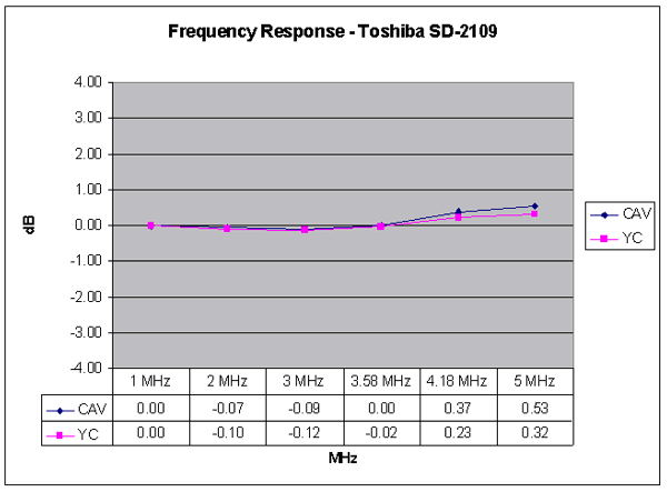 The CAV and YC outputs closely match, up to about 4 MHz. Then the CAV output is slightly higher. The video frequency response is flat out to about 3.58 MHz, then both shoot upwards. The CAV output is 0.53 dB at 5 MHz.