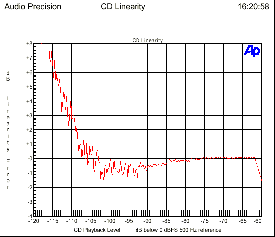 Low-Level DAC LinearityDAC linearity was mediocre. It stayed within ± 1 dB of linear down to – 93 dB. It wasn't really all that bad, but indicates not so carefully selected parts. Did this model tout 24-bit DACs? If it did, the benefit is primarily marketing specs.