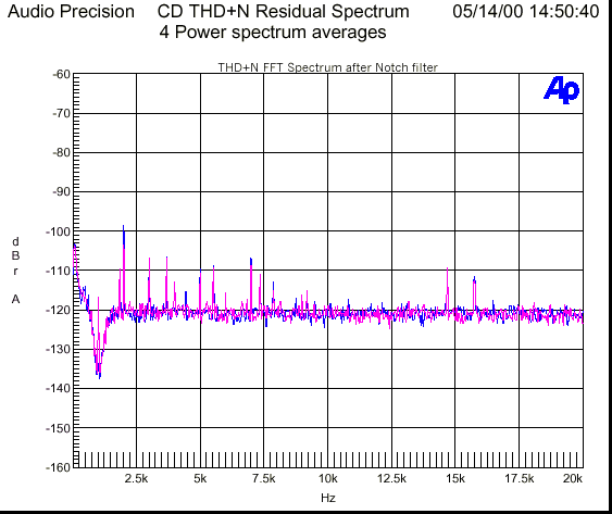 The Noise floor unassisted by AC filtering wasn't too bad either. The 60 Hz AC power line component was a good –108 dB down, with the next substantial component at 300 Hz at –123 dB. There was also a spike that peaked just above 20 kHz, at about the same level. Actually, the noise floor was really good within the audible range. There was a bit of ultrasonic trash, but all below –110 dB.