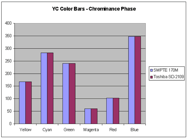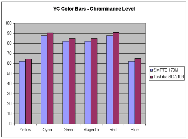 The chroma level is higher than SMPTE 170M. The Chroma phase of the YC output is perfect.