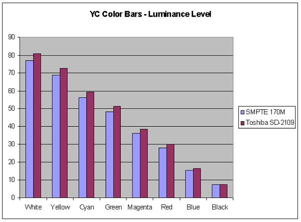 Format Black White Comments CAV 7.5 104.2 The black level is perfect. White, like all Toshiba DVD players, is VERY hot. Some video processors will clip everything above 100 IRE. YC 7.5 103.7 The YC levels closely match the CAV levels. Color Bars